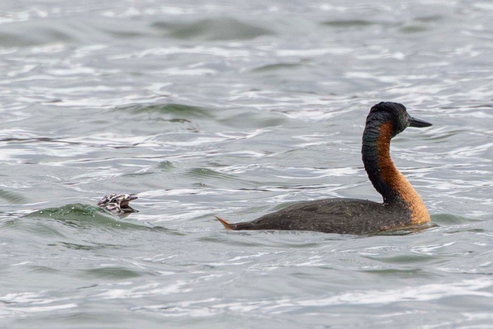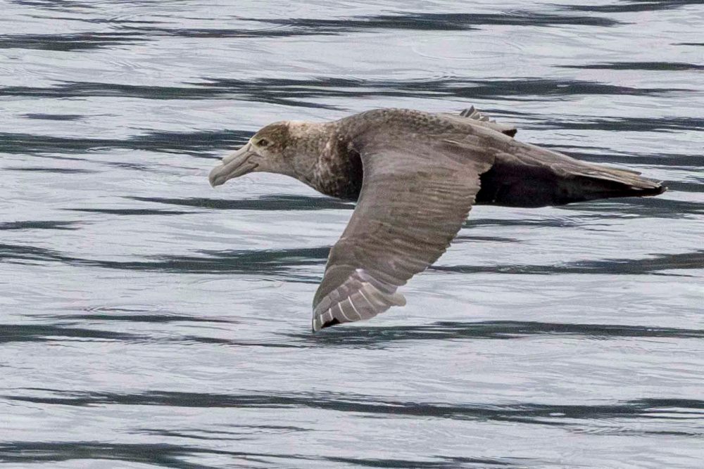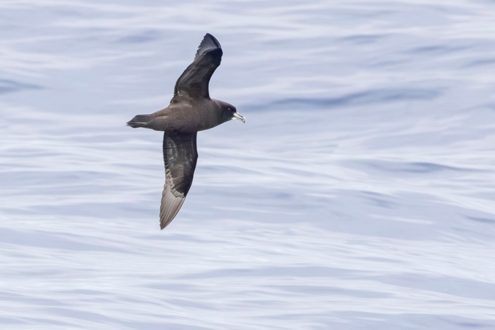 その後は海の上を飛ぶ鳥達を追いかけて、飛ぶ鳥のショットの練習をしました。ノドジロクロミズナギドリです。500枚ぐらい撮って、この2枚だけがなんとか見られるショットでした。 After that, I practiced photographing birds in flight by following the seabirds. This is a White-chinned Petrel. I took about 500 shots, and these two were the only ones that turned out somewhat decent.