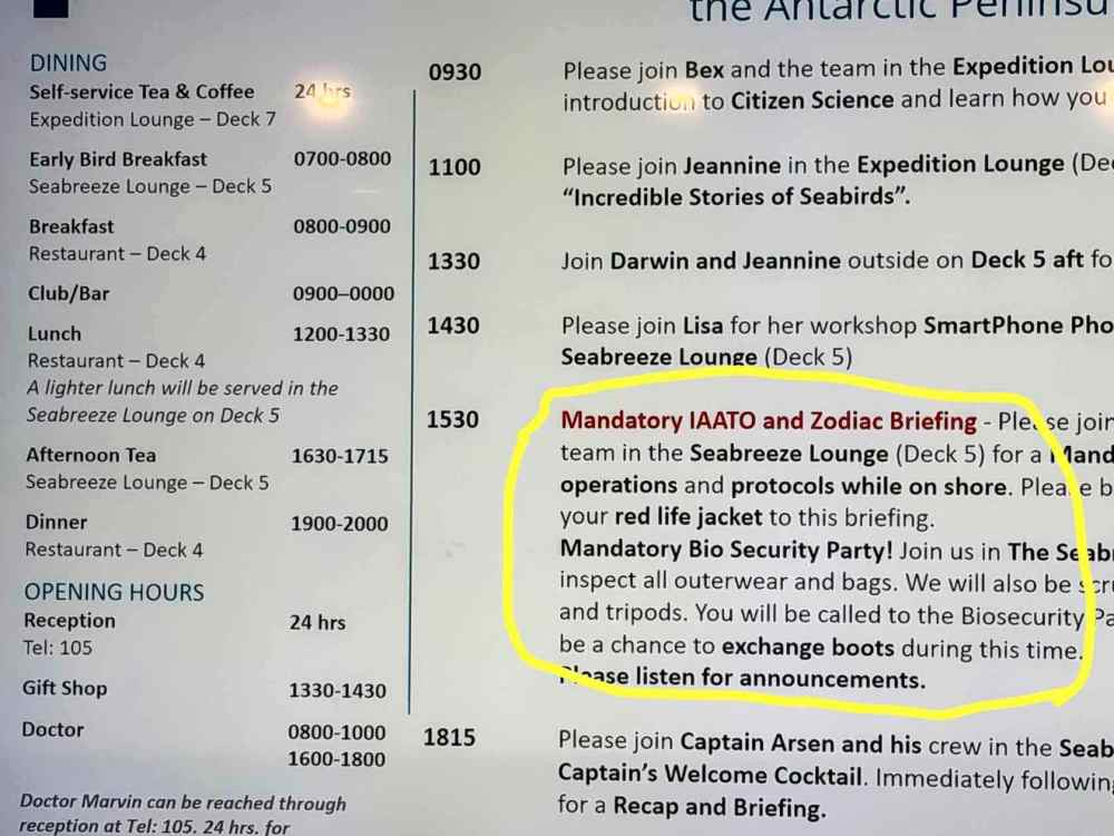 注目は、バイオセキュリティーのチェックがあったことです。南極やそれぞれの島に上陸する際には、島の地面に触れることが許されているのは、支給されたブーツのみです。三脚もダメ、バックパックやカメラも手袋も全てダメです。地面に触れなくても、しゃがむことすら許されませんでした。だから、島に持って行くであろうすべての所持品を持って会場に行き、丁寧に検査されました。とりわけマジックテープ類、ジャケットのポケットの中、バックパックの底の方に溜まっていた小さな砂まで掃除機で吸い取られました。私の場合は、支給されたブーツの底の一角にカビのようなものが付着していたようなので、デッキで消毒してもらいました。 The key point was the biosecurity check. When landing in Antarctica or on any islands, only the issued boots are permitted to touch the ground. Tripods are forbidden, as are backpacks, cameras, gloves—absolutely everything. Even crouching down was forbidden, regardless of whether you touched the ground. Consequently, we took all belongings we planned to bring to the islands to the venue for meticulous inspection. Particular attention was paid to Velcro items, jacket pockets, and even the tiniest grains of sand accumulated at the bottom of backpacks, which were vacuumed out. In my case, a mold-like substance appeared to be attached to one corner of the sole of my issued boots, so they were disinfected on deck.