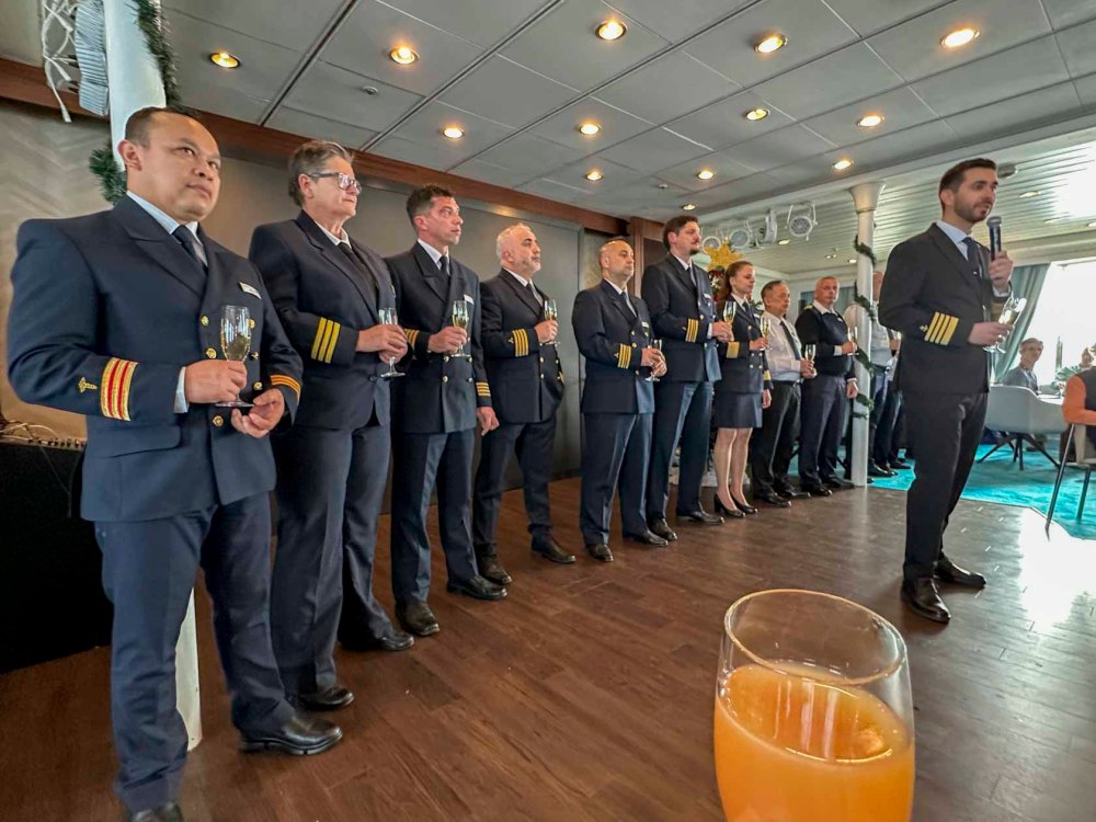 その後、夕食前に船長と船員たちの歓迎のご挨拶がありました。左側の制服を着た人たちはオフィサーです。キャプテンと共に7階のブリッジにいる人たちで、会う機会はほとんどありませんでした。右側の人たちはスタッフメンバーで、何らかのサイエンティストやスペシャリストです。だからほとんど毎日会っていました。 After that, the captain and crew gave a welcome address before dinner. The people in uniforms on the left are officers. They work alongside the captain on the bridge on the 7th floor, and we rarely had the chance to meet them. The people on the right are staff members, scientists or specialists of some kind. So we saw them almost every day.