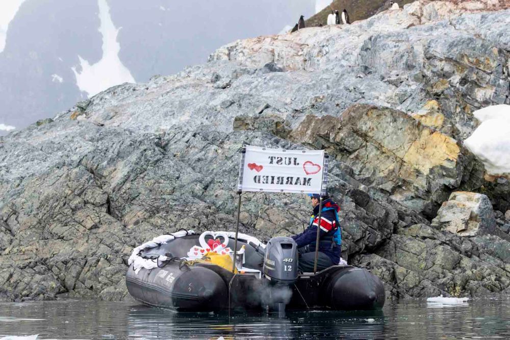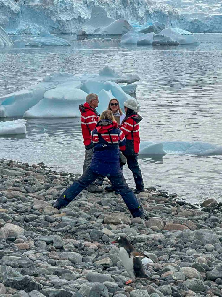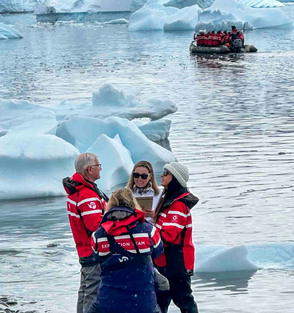 初めてのゴムボートクルーズなのでみんなもたついています。 It’s everyone’s first time on a zodiac cruise, so they’re all a bit nervous.
