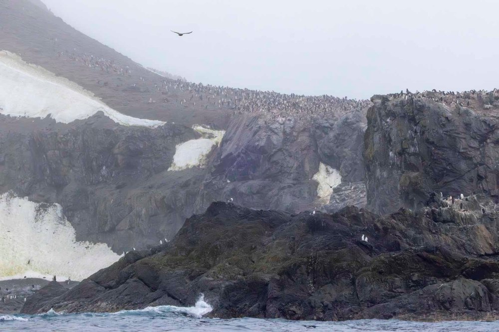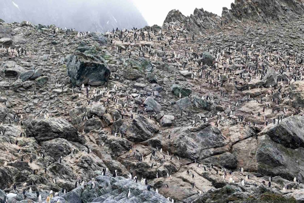 ヒゲペンギンのコロニー A colony of Chinstrap penguins丘の上の方までヒゲペンギンで埋まってました。 All the way up the hill, it was covered in Chinstrap penguins.隆起した巨岩の多くは変成岩でできていると言われています。 It is said that many of the uplifted boulders are composed of metamorphic rock.