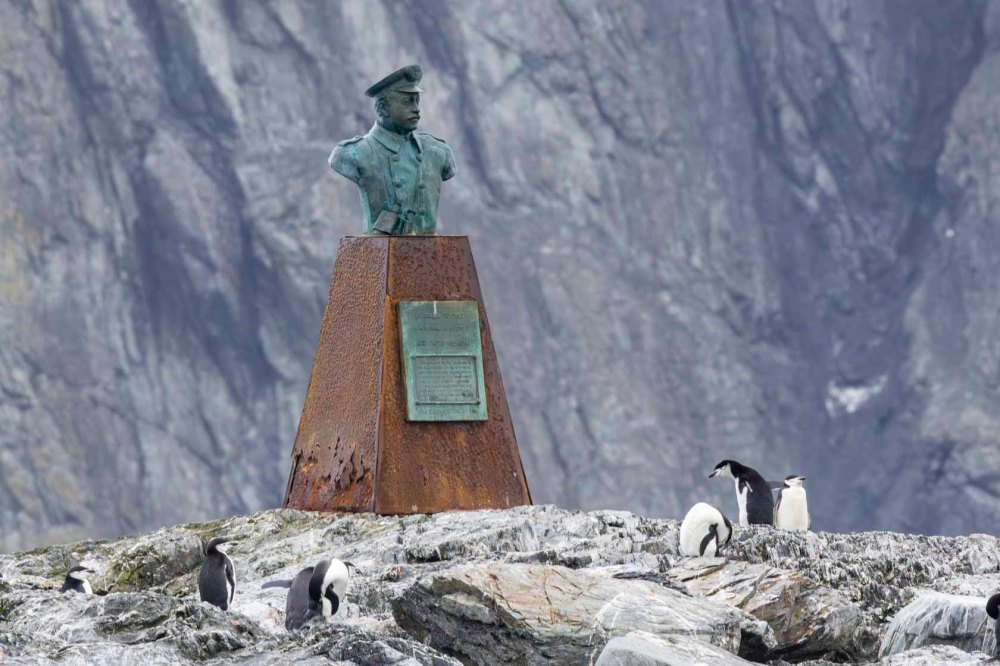 シャクルトンの隊員達は、何もないこの場所で救出されることを信じて4ヶ月間も生活していました。彼らが過ごしたケープワイルドには、救助に向かってくれたチリ海軍の将校ルイス パルドの銅像が立っています。ヒゲペンギンも敬意を表してお辞儀をしてますね。 Shackleton’s men lived for four months in this barren place, believing they would be rescued. At Cape Wilde, where they spent that time, stands a bronze statue of Chilean naval officer Luis Pardo, who led the rescue mission. Even the Chinstrap penguins bow in respect.