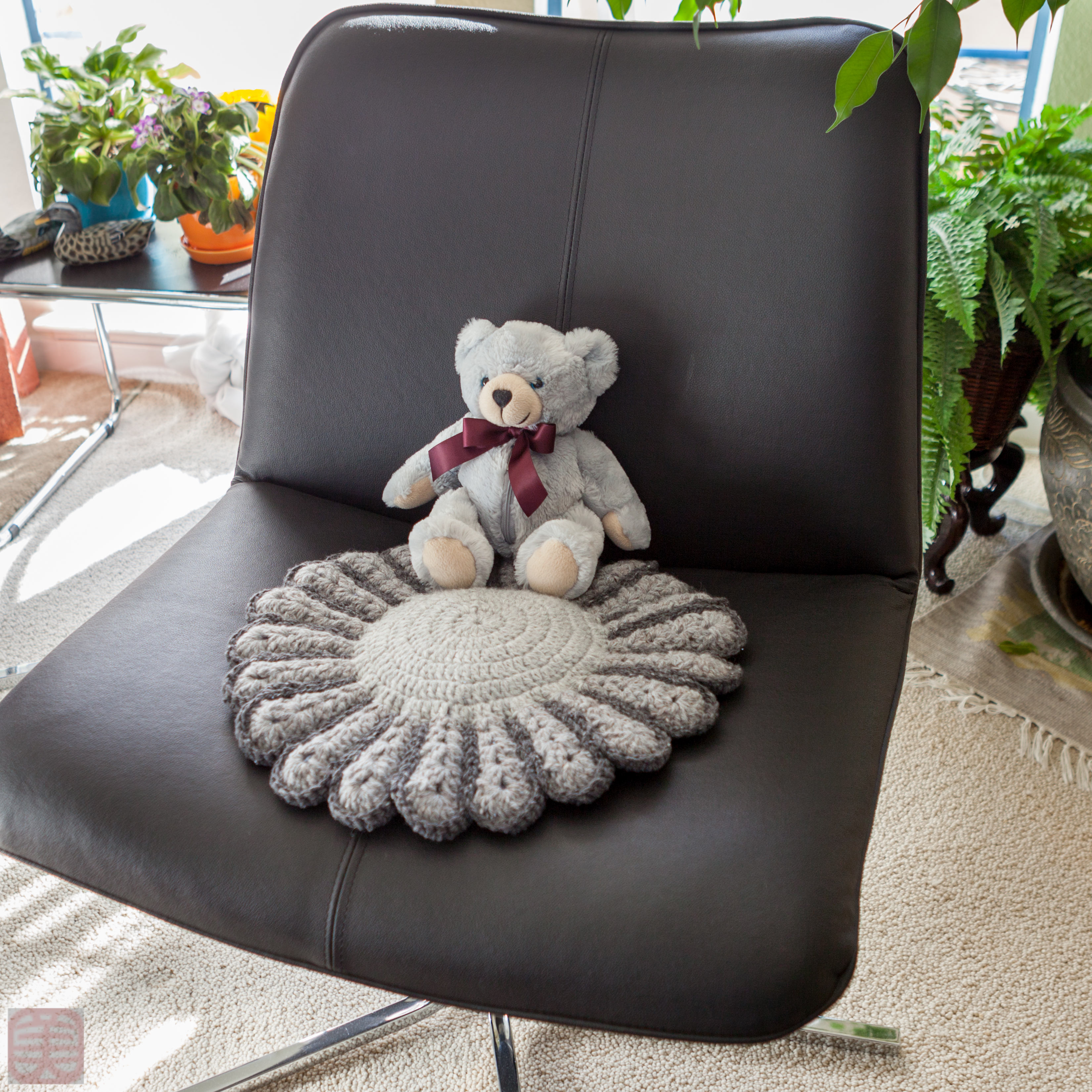 お座布団も編めないのかなーとおもいつつかなり大きめに編んで中に詰め物もしたけど、ポッコリ小山ができただけでお座布団というわけにはいかない。