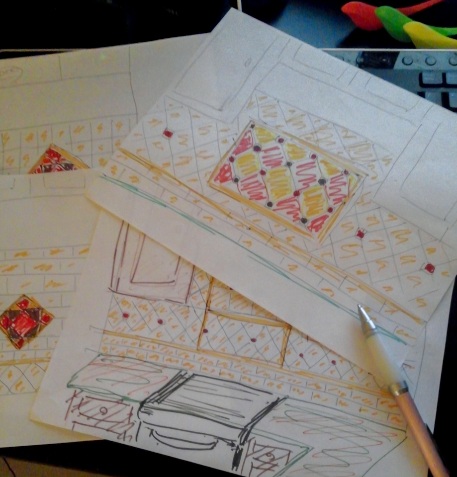 バックスプラッシュのデザインなんかもスケッチしてみたけど、どれもイマイチかな。