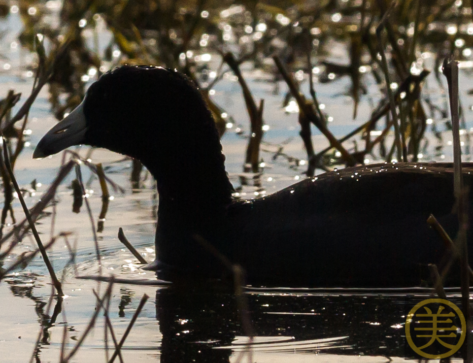 ダイヤをちりばめたよう。光に輝いて水滴をのせたまま泳いでいるCoots。