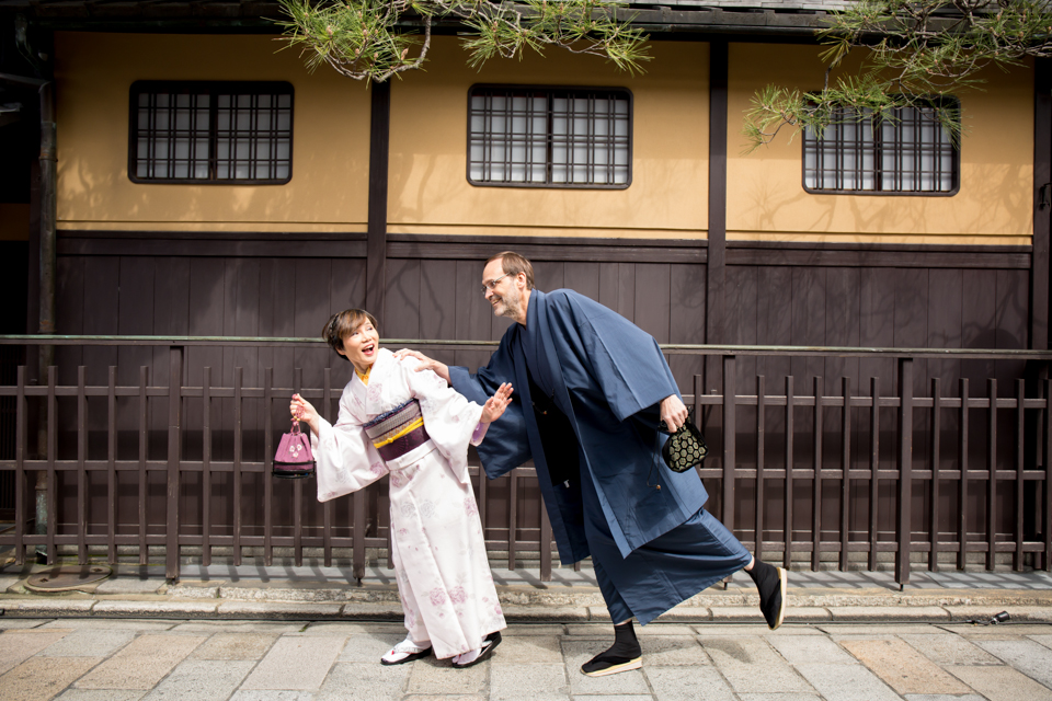 いやはや、ここでもてんやわんや状態。着物を選んで、メイクとヘア、そして着付け。すでに観光客で満杯なのに、京都近辺の大学の卒業式が拍車をかけます。ほとんどが10代、20代の若者だからその熱気たるや大変なものです。そう、私達がダントツで年寄りでしたが。そんなの気にしません。