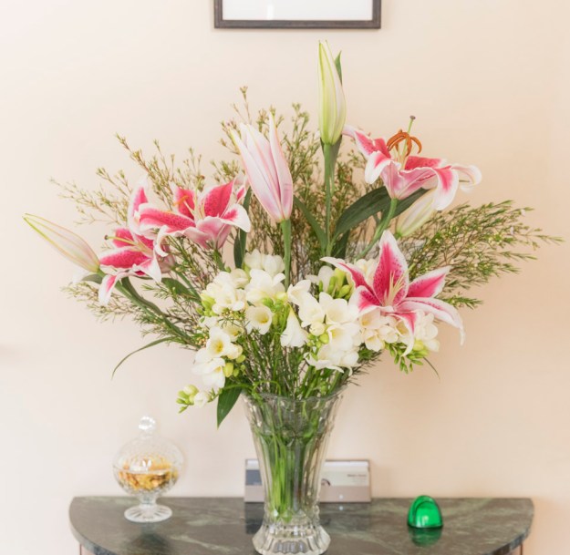 今日はお誕生日会に招待されています。百合の花の名前の方が招待してくれたので、百合の花を適当に生けてみました。もう開き切っている花もありますが、まあ、気持ちね。出かける前にパチリ。減量をしようとしているのに、しょっぱなから苦しい出だし・・・