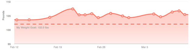一時期102ポンドを切ったことがありましたが、すぐバウンスバックしてしまいました。今回の私の目標は、103ポンドを切ることです。