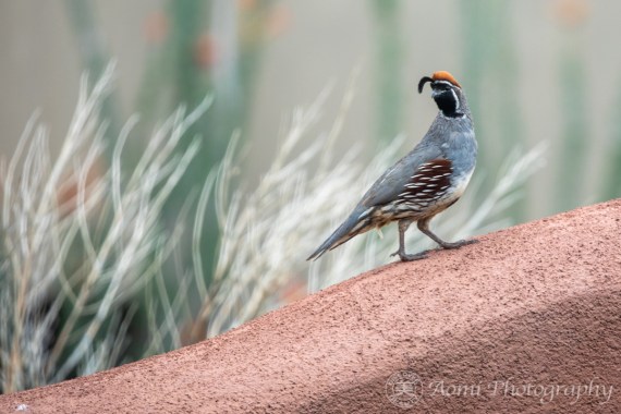 背景の Ocotillo のオレンジの花とウズラの頭がマッチして、いい感じ。