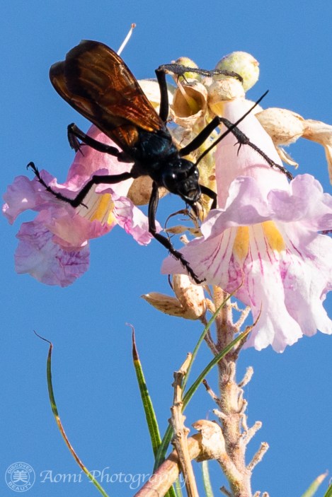 朝のコーヒーを飲みながらぼんやりと前庭を眺めていると、鳥にしては小さすぎる「何か」がデサートウィローの木のあたりを飛び回っているのに気がつきました。急いでカメラを持ち出してみると、この巨大なハチ。 – With a cup of morning coffee, we were admiring the pretty view in the front yard. Then we realized that a large “something”, but not as large as a bird, was flying around the Desert Willow tree. Quickly bringing out our cameras, we found this gigantic wasp.