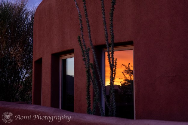私のオフィスの窓に映った夕日。A sunset image reflected on my office window.
