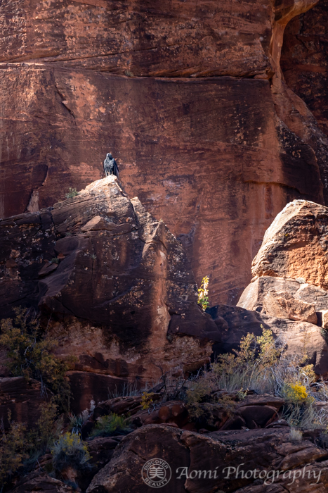 これがビューポイントからの眺め。巣は高い所に作られたんですが、あまりにも早く巣立ちしすぎて、巣に戻れなくなってしまい、今の場所、巣から多分 0.25km ぐらい下の岩の上に住むようになったとレンジャーが話してくれました。- This is a view from the viewpoint. The nest was made at much higher place, but the chick couldn’t get back to the nest after it fledged. A ranger told us that it was too soon for the baby to take off. So, baby is standing about 500 feet below on a rock since then.