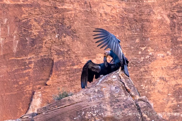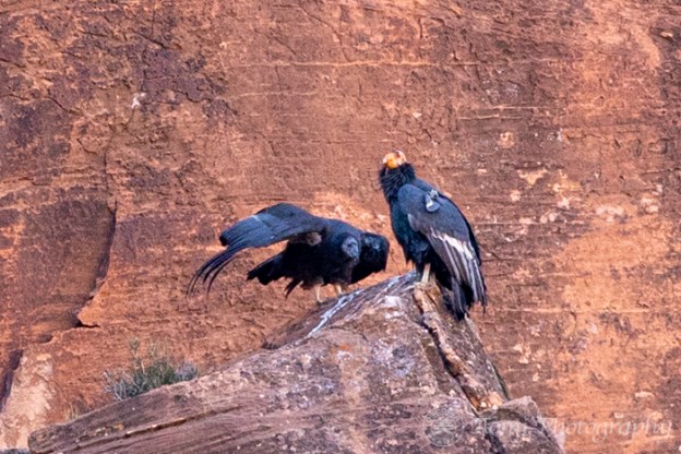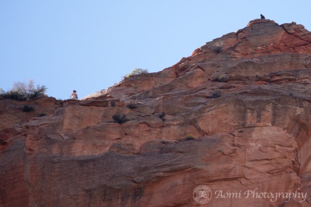そして、面白いことにコンドルがこんなに近くにいるのに気がつかない人もいる。左、カメラを持った人間。右、人間を見つめるコンドル。- On the other hand, it’s funny that some people don’t know how close a condor is to them. On the left, a human with a camera on Angel’s Landing trail. On the right, a condor looking at the human.