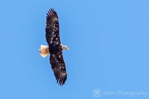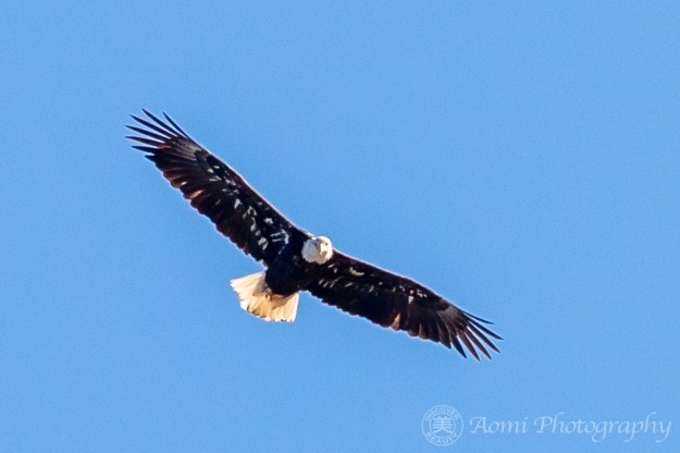 そして、期待通り白頭ワシに出会うことができました。空高く飛行していたので、私の400mmレンズではこれが精一杯でした。- And we could indeed see a Bald Eagle. It was flying so high in the sky, this is my best shot with my 400mm lens.