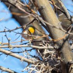 目下アメリカツリスガラたちは巣作りの真っ最中。以下の写真は裏庭の木に作られつつある彼らの巣です。身の丈以上もある枝やフワフラしたものを巣に運んでいます。 – Now, Verdin are in the middle of making nests. The pictures below are Verdins working hard, bringing twigs longer than themselves, and bringing fluffy stuff to the future nest.