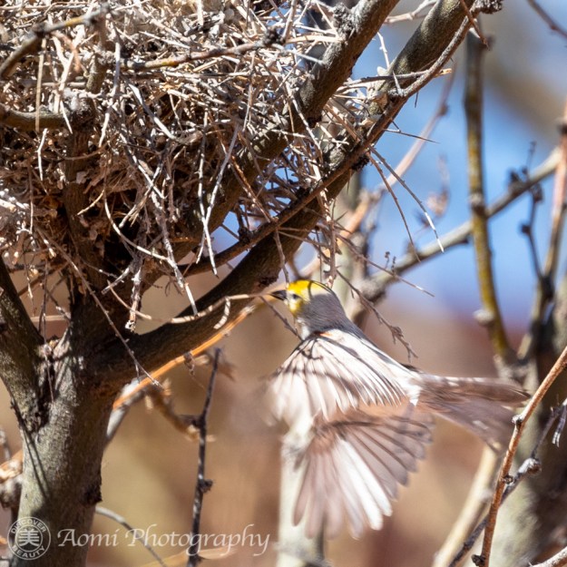 青空を背に受けて、今日も元気なアメリカツリスガラ。 – Verdin is even more cheerful with blue sky today.