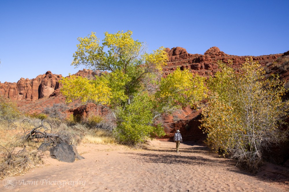 ジョンソン キャニオンのトレイルから川道に降りて、コットンウッドの林の中に入って行った。
