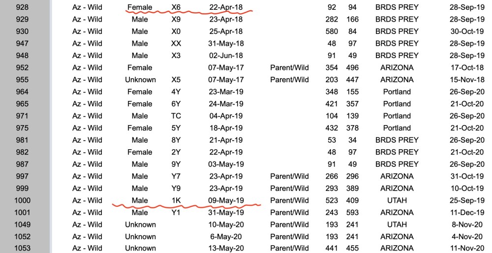 去年のコンドルとは別のコンドルですが、やっぱりいました。すでに「X6」と名前のタグと追跡ラジオアンテナがついています。早速ペルグリン財団のデータベースを調べてみました。なるほど、2018年の8月に生まれたメスです。Sure enough, we did. There was a new juvenile with a name tag, “X6”, and radio antenna. So I checked the Peregrine Fund website. Yes, I could find “X6” in the list, a female condor, born in August 2018.
