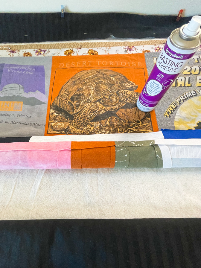 全ての T シャツパネルを繋ぎ合わせると、予想外に大きなキルトになってしまいました。クイーンサイズベッドの横幅と同じぐらい。ここから表布と裏布、その中に綿のバッティングを入れて固定するサンドイッチ作業に入ります。ピンで止めることはもちろんできます。でも、大きなサイズだから、結局ぐちゃぐちゃになりそうだし・・・と思案していました。It became quite large when I sewed all the T-shirt panels together, like a queen size bed. From here, I will move to the next step, make a sandwich with the back fabric, cotton batting, and front fabric together. Of course, I will use pins to hold it together, but I really wonder if it won’t hold and stay positioned together because the size of the quilt is so large. I wave been wondering what I can do for it for a long time.