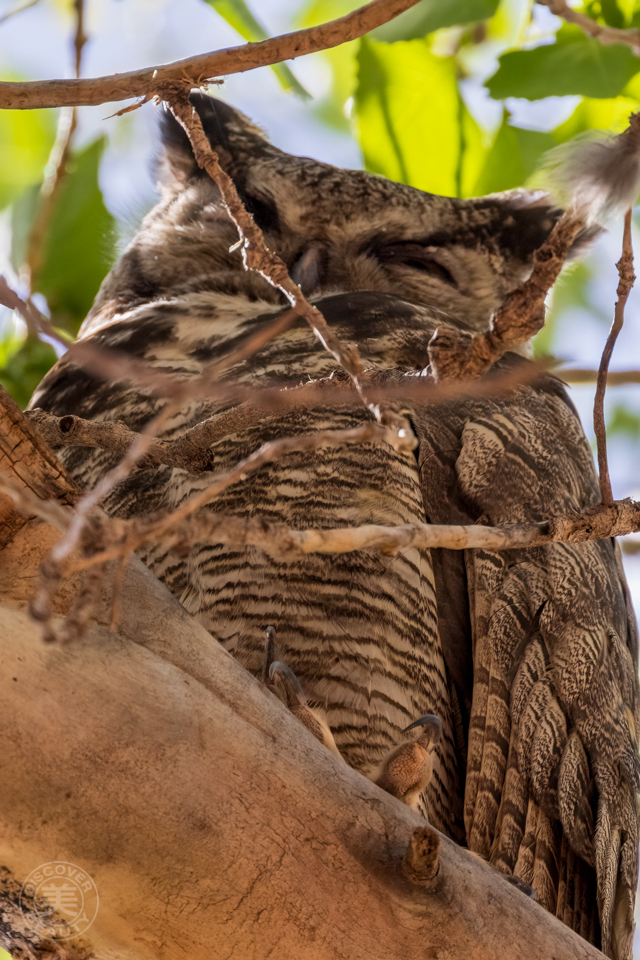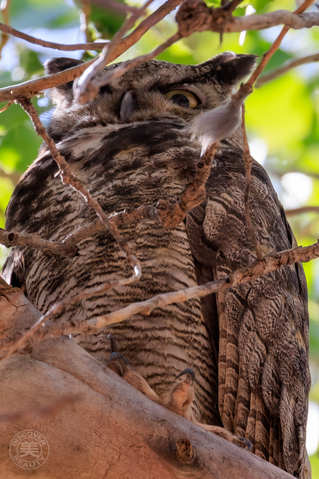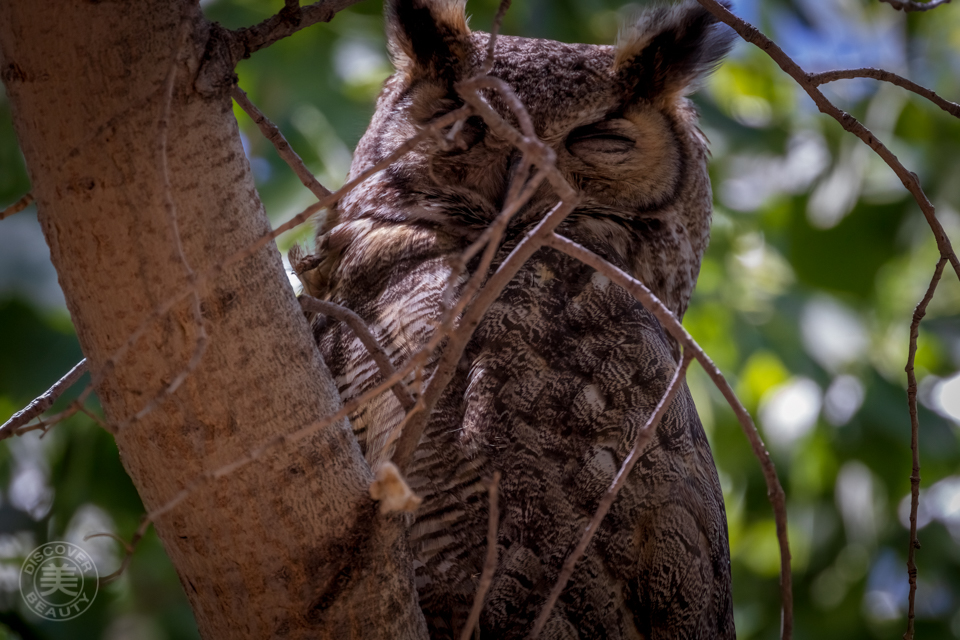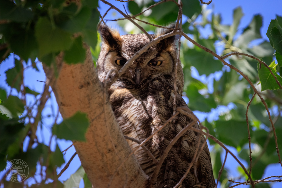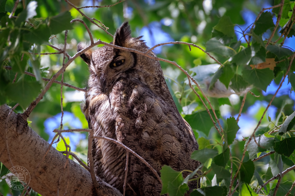 4.2kmの短いハイキング。コットンウッドの木々がしげる山道を辿っていくと、いた! アメリカワシミミズクです。On a short, 2.5 mile long trail through cottonwood trees, we looked for Great-horned owls. There, we found them.