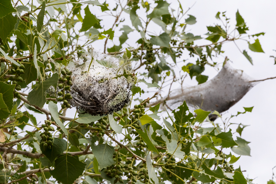 近寄ってみると、テントキャタピラーの巣が至る所に作られています。テントのような巣を作るのでそう呼ばれています。 When we went closer, we found many tent caterpillar’s nests on the tree branches. They are called “tent caterpillars” because the nest is really like a tent.