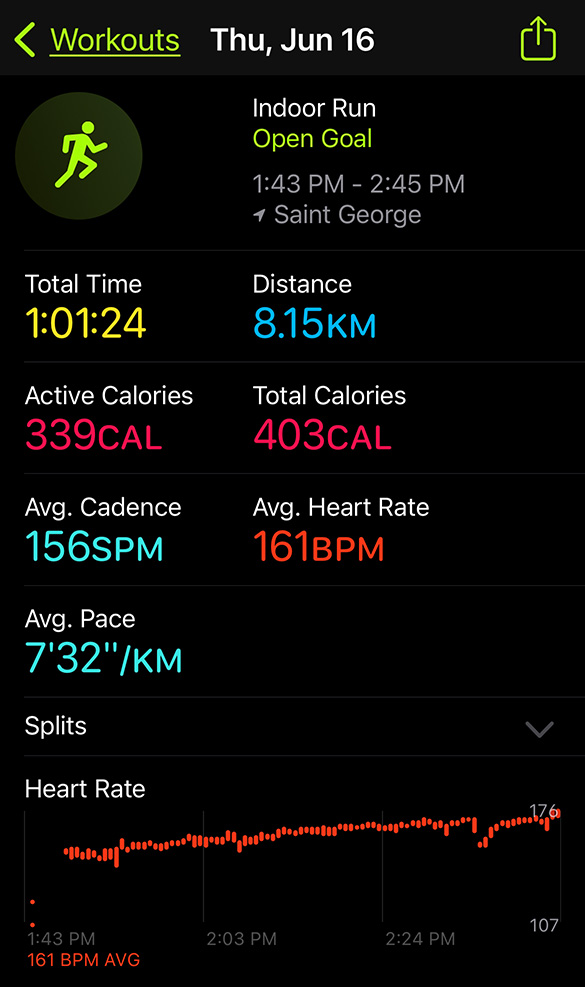 とりあえず、昨日、60分でどれだけ走れるのか試してみました。勾配度は0度です。8kmでした。アップルウォッチによると、平均ペースが7分32秒なので、練習すれば75分ぐらいで走れるのかもしれません。流石に最後の方は疲れてきましたが、このペースなら苦しくない。きっと10K大丈夫です。 For the time being, I tested myself yesterday how far I can run in 60 minutes. I ran 8km (4.9 miles) with no elevation gain. It is possible to run 10K in about 75 minutes if I practice well based on the average pace of 7’32″/km that my Apple watch measured. I was tired towards the end of the 60 minutes, but my heart didn’t complain with this pace. So, “Yes”, I can do this if I train myself. I can run two more kilometers.