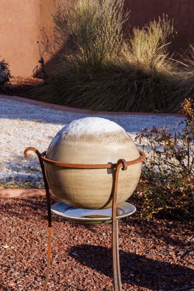わーい、球形の飾りの上にも雪が積もって、帽子をかぶっているみたい。 How cute it is to see snow on top of the sphere ornament in the backyard. It’s like it has a snow cap on it.