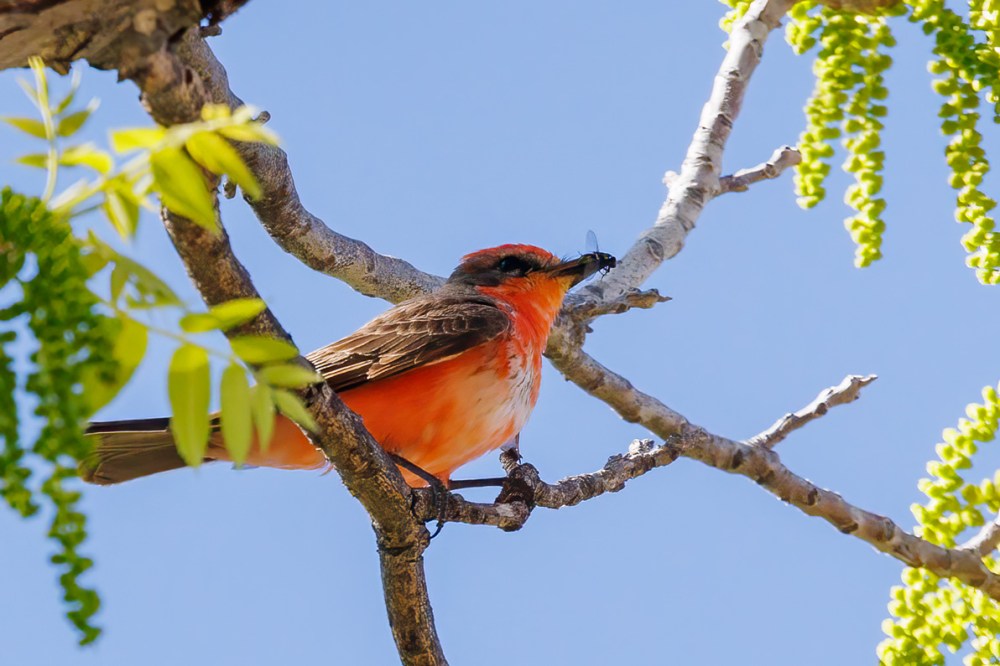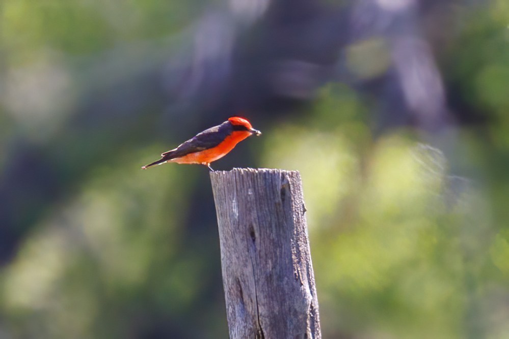 でも、遠すぎて、しかも三脚なしで重い400mmレンズを持って撮るのは、私にはかなり難しい作業でした。ようやく撮れた、成長しきってないベニタイランチョウ。くちばしに何か咥えています。 But it was too far away, and also taking pictures with a heavy 400mm lens without a tripod was quite a difficult task for me. Finally, I was able to take this photo of an first-year Vermilion Flycatcher. It is holding something in its beak.
