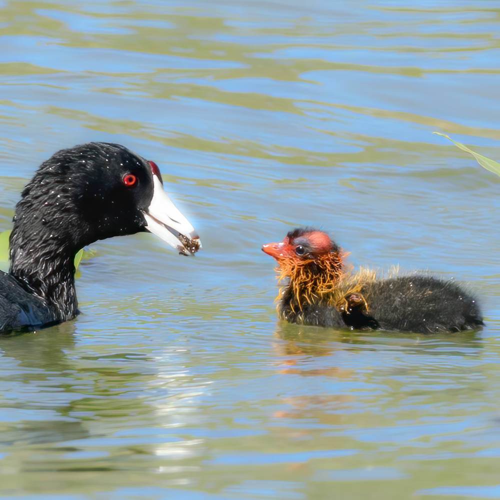 追記です。以下の写真はアメリカオオバンの親子です。オオバンは北アメリカ全土、湖や池があれば大抵見られる鳥です。しかも何十もの群れをなしています。真っ黒の体に白い嘴で、大きさはアヒルより小さいです。足は短くて太っています。そんな風貌はツルとは真逆なのに、ツル目に属しています。面白いですね!