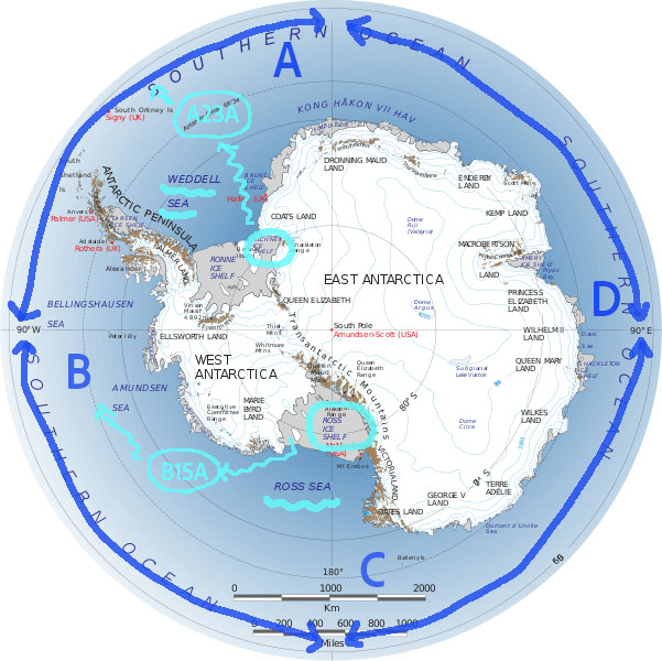 その後、B-15 は北上を続け分裂を続け、子供氷山はB-15A から始まりB-15Z まで分裂し続けました。 Since then, B-15 continued its northward drift while splitting further, with the daughter icebergs continuing to break off from B-15A through to B-15Z.