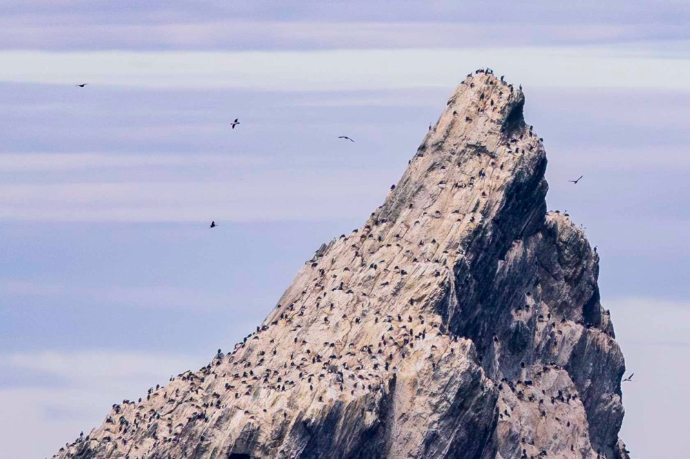 船の甲板に出ると、大量のヒメウが上空を飛んでいました。その量の多さに圧倒されました。 Upon stepping out onto the ship’s deck, I was overwhelmed by the sheer number of shags overhead.