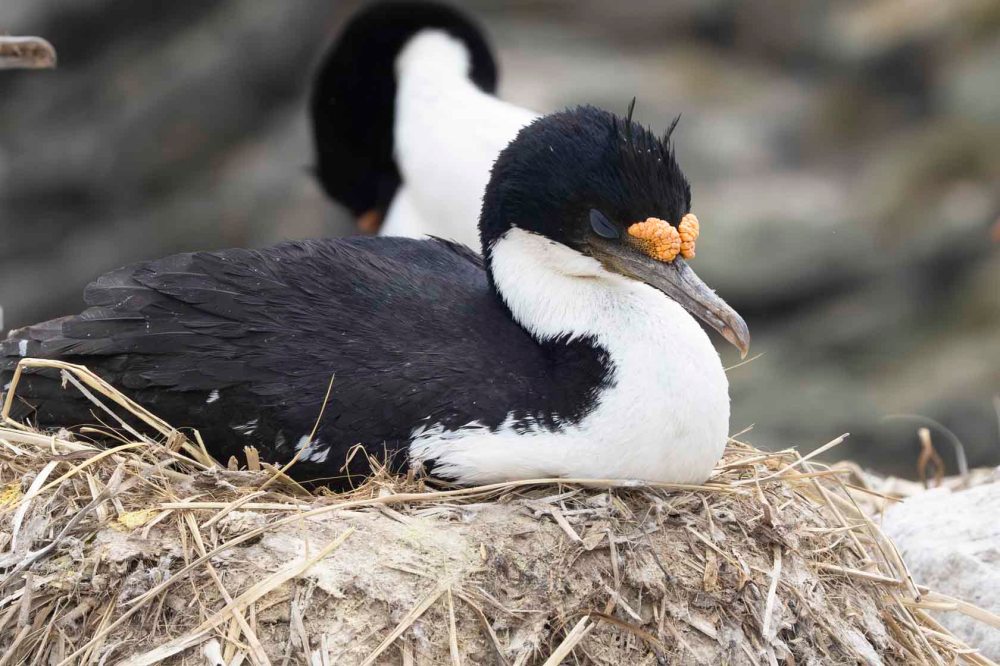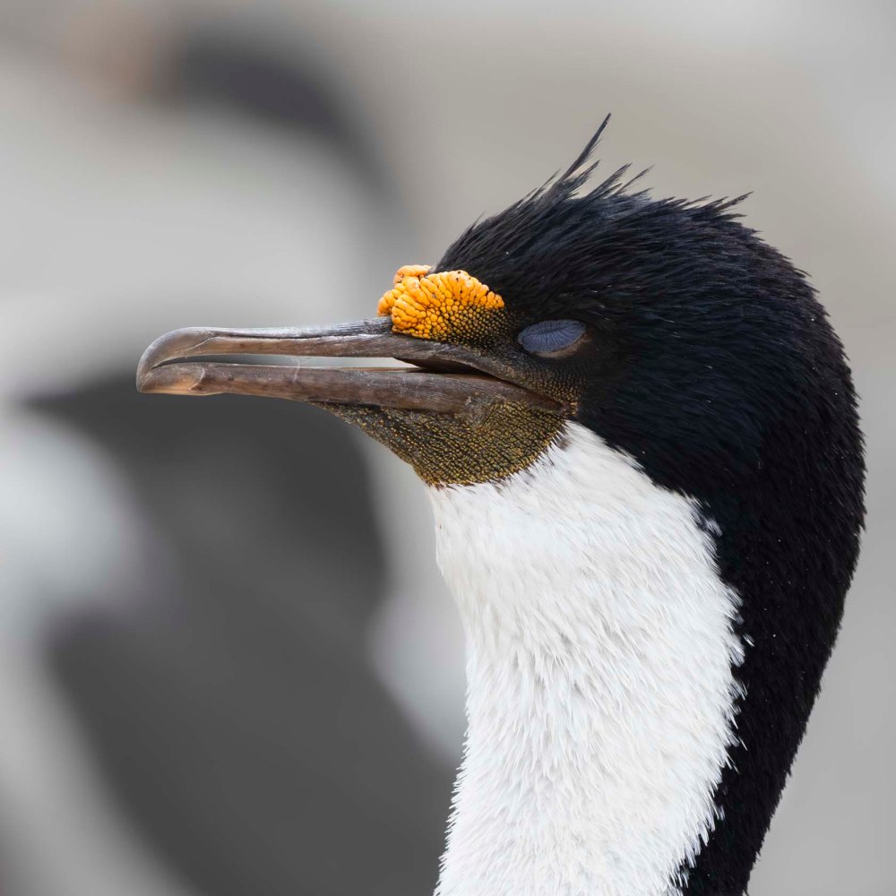 こちらの写真は、お昼寝最中のナンキョクムナジロヒメウですが、目を閉じていても青い。ということは、青い部分は目の周りにある皮膚なんですね。 These photographs show Antarctic shags in the midst of their afternoon nap, yet even with their eyes closed, it appears blue. This indicates that the blue colouration is actually the skin surrounding the eyes.