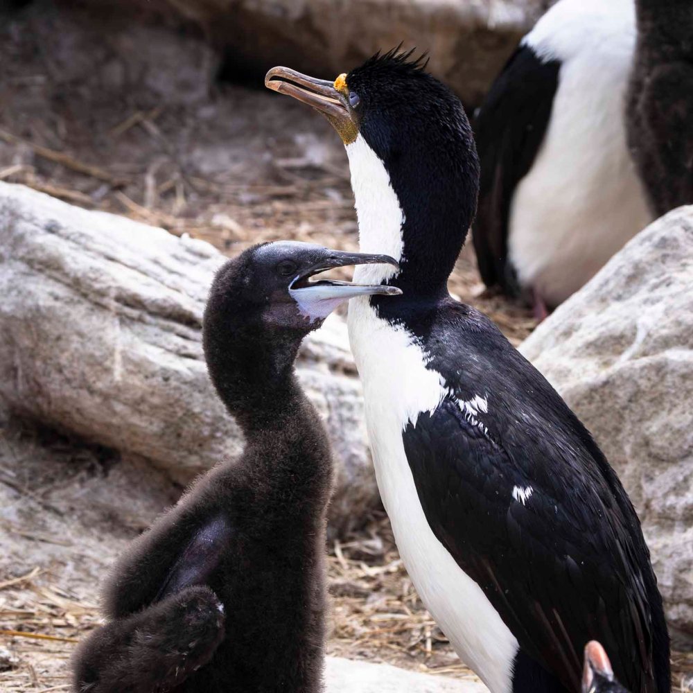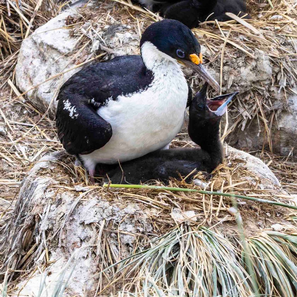 ナンキョクムナジロヒメウのヒナは羽毛が全く生えていない状態で生まれてきます。上の写真を見ると、フワフワの羽毛が生え揃っているようですが、頭にはまだ生えていないことがわかります。生まれてから3週間ぐらいで生えそろうそうです。その間、寒さで死んでしまわないようにお母さんヒメウがずーっと座り続けて温め、お父さんヒメウはせっせと餌を運んでくるということらしいです。 The chicks of the Antarctic shag are born completely featherless. Looking at the photo above, it appears they have grown a full set of fluffy feathers, but you can see their heads are still bare. It is said that they take about three weeks after hatching for their feathers to fully grow in. During this time, the mother shag apparently sits constantly to keep them warm so they don’t freeze to death, while the father shag diligently brings them food.