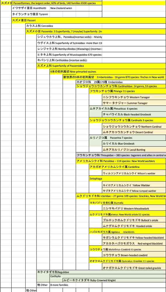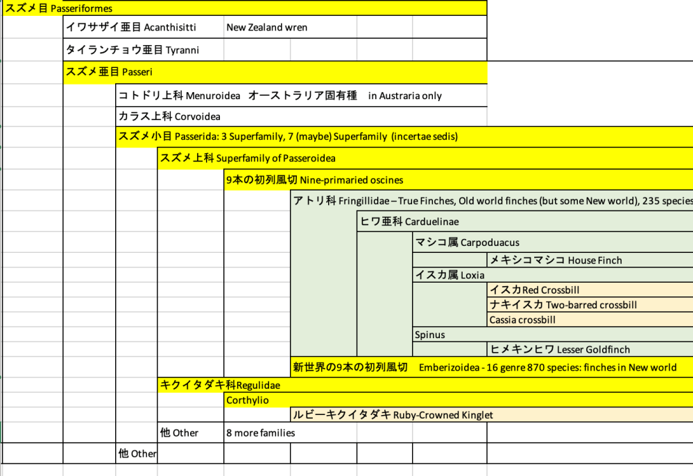 それを話す前に、分類表を訂正しました。下の表の緑色の部分、アトリ科の中にあった3種の鳥を他の科に移動し、新たにイスカ属を加えました。 Before I start talking about it, I have made some corrections to my classification table. In the green part of the table below, I moved three bird species that were in the family Fringillidae to other families and added a new genus, Loxia.