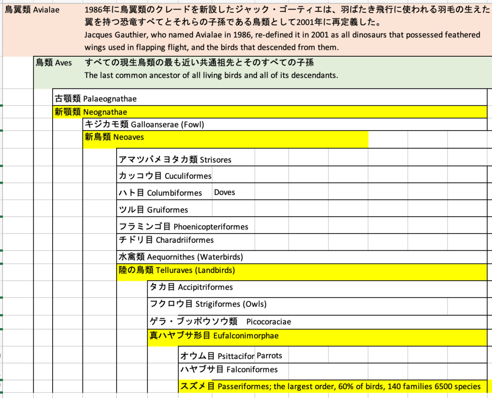 そうそう、もう一つ大切な項目を鳥類の上に付け加えました。それは「鳥翼類」です。 Oh yes, I added one more important item above Aves. It is called “Avialae.”