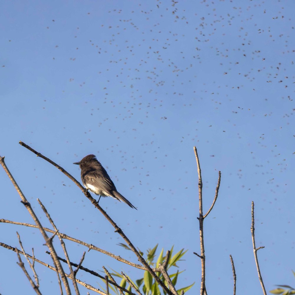 日の出から 1-2 時間ぐらいの間は鳥たちの朝食の時間です。しかも、食べ物が空を飛んでいるので、時々空に飛び立って口をぱくぱくさせればいいだけです。 About 1-2 hours after sunrise is breakfast time for birds. And since food is flying in the air, all they have to do is fly up into the sky from time to time and snap their beaks.