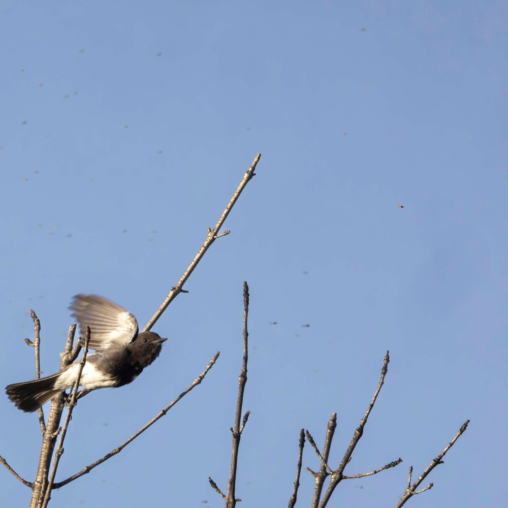 クロツキヒメハエトリは空中の虫を嘴を大きく開けて空中で捕食します。ツバメやヨダカ、アマツバメも空中捕食組ですね。 The Black Phoebe preys on aerial insects with its beak wide open in mid-air. Swallows, Nighthawks, and Swifts are also airborne predators.