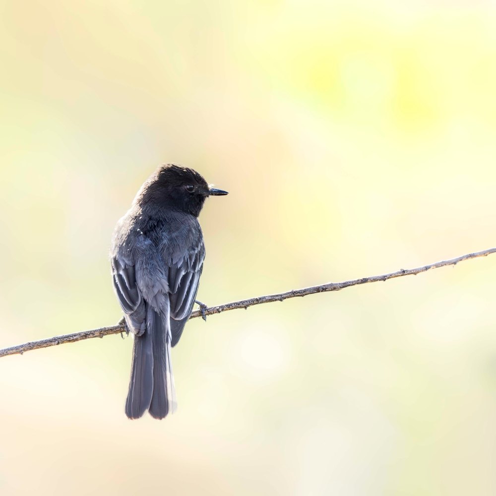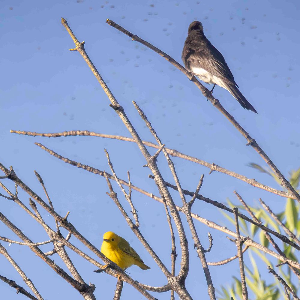 こんな風に2羽を近くに並べてみると、大きさの差がよくわかります。クロツキヒメハエトリの長さは6.3インチ(16 cm)ですが、キイロアメリカムシクイは4.7〜5.1インチ(12〜13 cm)です。 When the two birds are placed close together like this, the difference in size can be clearly seen. The Black Phoebe is 6.3 inches (16 cm) long, while the Yellow Warbler is 4.7 to 5.1 inches (12 to 13 cm) long.