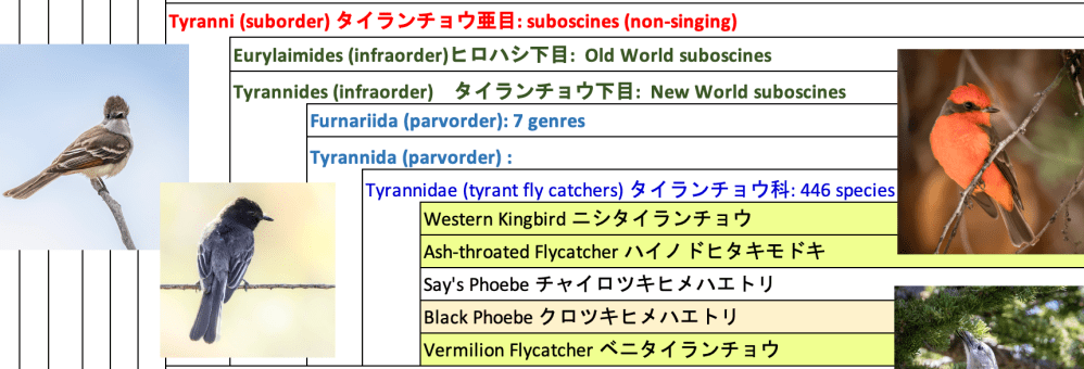 両種とも虫を食べる鳥なのに違う亜目に分類されています。分類史を見ると過去同じ目に分類されていた時期もあったようですが、DNA研究によってはっきりとした違いがわかってきました。それと共に分類表も大幅な変更が所々で見られます。実際、私の分類表も去年始めた頃から多くの部分でアップデートしました。この分だと、今後も更なる変更が起こりそうです。 Both species are classified in different suborders, even though they are both insect-eating birds. Their taxonomic history shows that there was a time when they were classified in the same order, but DNA research has revealed clear differences. Along with this, the taxonomy tables have changed drastically in many places. In fact, I have updated many parts of my classification table since I started last year. At this rate, more changes are likely to occur in the future.