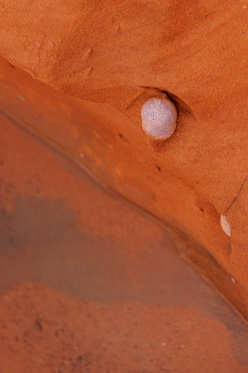 こちらの写真はモキマーブルがまだ完全に分離されていない段階です。雨が降って水にさらされることにより砂岩の侵食が進むと、ポロリと分離するんですね。面白いです。 The picture below shows a moqui ball that is still attached to the sandstone wall. I can see that rain water eroded some of the sand around it. I wonder how long it will take for this particular ball to come out from the wall as the erosion continues. Isn’t it interesting?