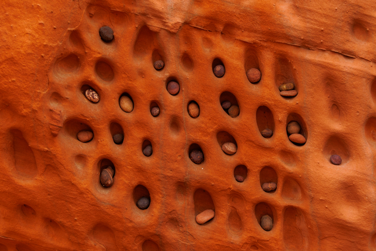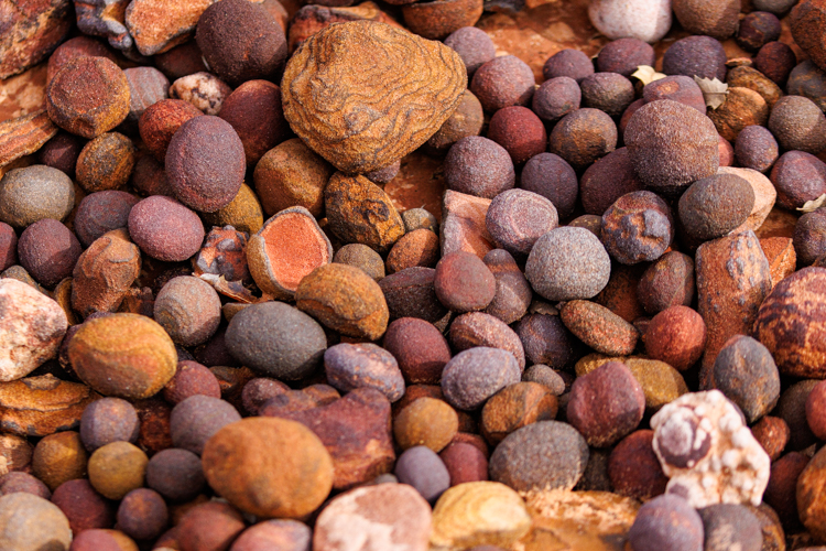 モキマーブルと名付けられているボール状の酸化鉄です。長い年月の後、ナバホ砂岩から鉄分が分離して、鉄が参加することによって赤みを帯び、ボール状になったものです。コンクリーションとも呼ばれています。 They are called “Moqui marbles” or “Moqui balls”. After millions of years, the iron separated from the Navajo sandstone, oxidized, and became a ball. It’s also called a “concretion.”