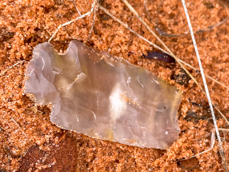かつてアメリカ先住民が狩猟のためにたくさん作っていたのでしょう。いくつか発見できました。先端は破れてますが、左端の根元が矢じりであったことを証明してくれます。 I imagine that American indigenous people made many arrowheads for hunting. We found a few. The left side of the sample above indicates that it was an arrowhead, although the tip on the right side was broken off.