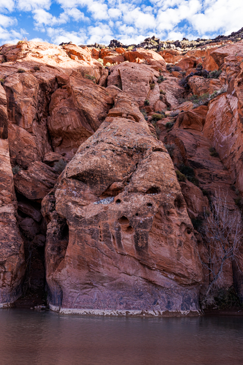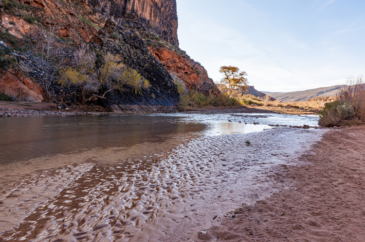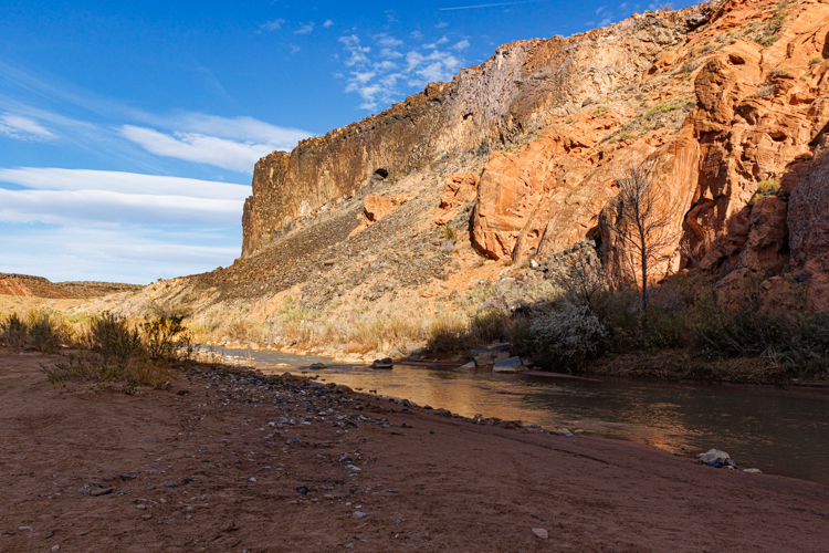 この川はザイオン国立公園内を貫き、渓谷を削りとってきた川として有名です。今は水量がそれほどありませんが、雨の後には水位がぐんと上がるはずです。下の写真、中腹にある棚に砂利が溜まっている事からも水位の変化がわかります。 The Virgin river is known because it carved a deep canyon for millions of years. This canyon was designated Zion National Park.