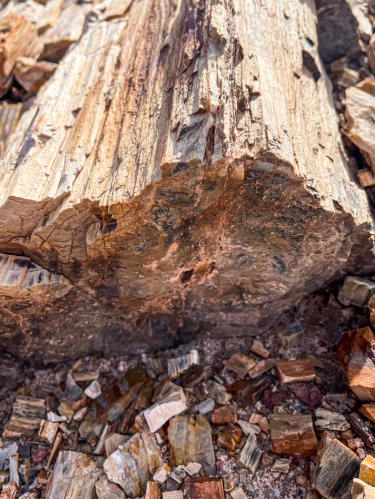 木が化石化するということは、木の中にミネラルが浸透し、それが1億年以上経って石になるということです。だから、小さな木片のように見えるものでも、拾ってみるとずっしり重い。 The petrification of a piece of wood means that minerals went in the wood and replaced the wood over 100 million years, so the wood became rock. Therefore, even a small wood chip is quit heavy when you pick it up.