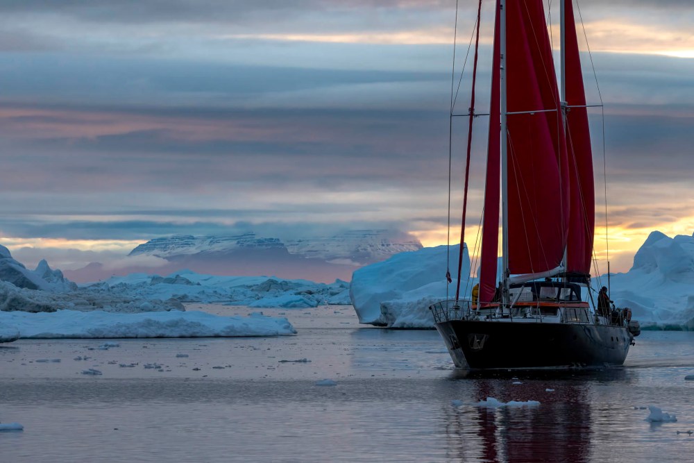 太陽が沈んでいくと、薄紅の中、遥か彼方にディスコ島が見えていました。 As the sun set, Disco Island was visible in the distance in a light red.