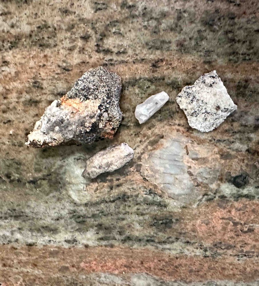 帰り道、作者が発見したように片麻岩を探しました。もちろん、深い知識がないので岩石を見てどんな石か区別ができるわけではありません。そこで、家のキッチンのカウンタートップと似たような模様なら、少なくとも花崗岩らしくなるので、そんな小さいかけらを拾ってホテルに戻りました。 On the way home, I looked for gneiss as the author discovered. Of course, not having in-depth knowledge, I could not distinguish what kind of stone it was by looking at the rock. So I picked up small pieces of gneiss that looked like granite, at least it had a similar pattern to the kitchen counter top at home.