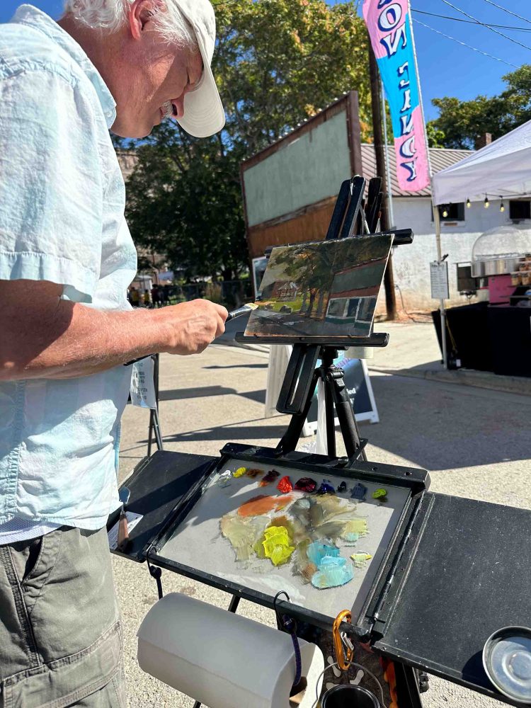 バンちゃんのテントの横でアーティストが2時間のタイムリミットで絵を描いていました。 An artist was painting next to Banchan’s canopy with a two-hour time limit.