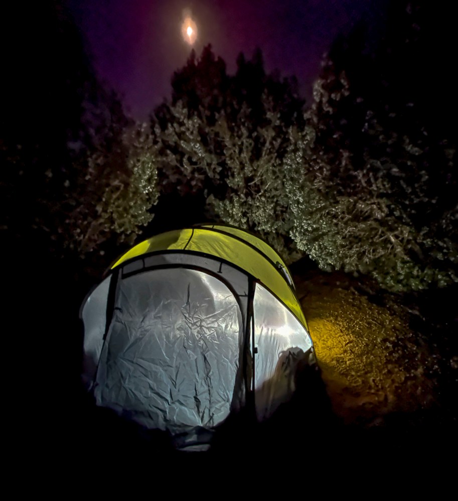 ジュニパーの木に囲まれた場所を選びました。We chose a spot surrounded by juniper trees.月明かりが眩しすぎるくらいでした。 The moonlight was too bright.
