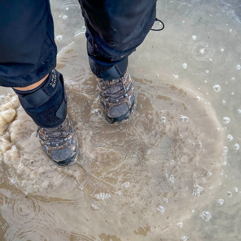 雨の中、一歩足を踏み込むたびに石灰の泥が登山靴にくっ付いて、久しぶりに泥まみれのハイクとなりました。車に乗る前、水たまりで靴を洗っているところ。 In the rain, with every step I took, chalky mud stuck to my hiking boots, making it a muddy hike for the first time in ages. Here I am washing my boots in a puddle before getting in the car.