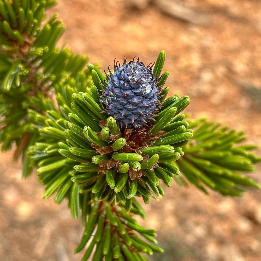 なぜなら、アーチの近くでこの青紫色の松ぼっくりに再会できたからです。ブリスタルコーンパインのコーン。 Because we were able to reunite with this blue-purple pinecone near the arch. The cone of the bristlecone pine tree.